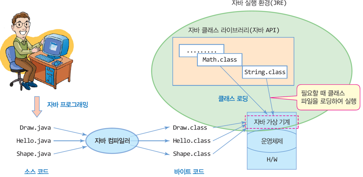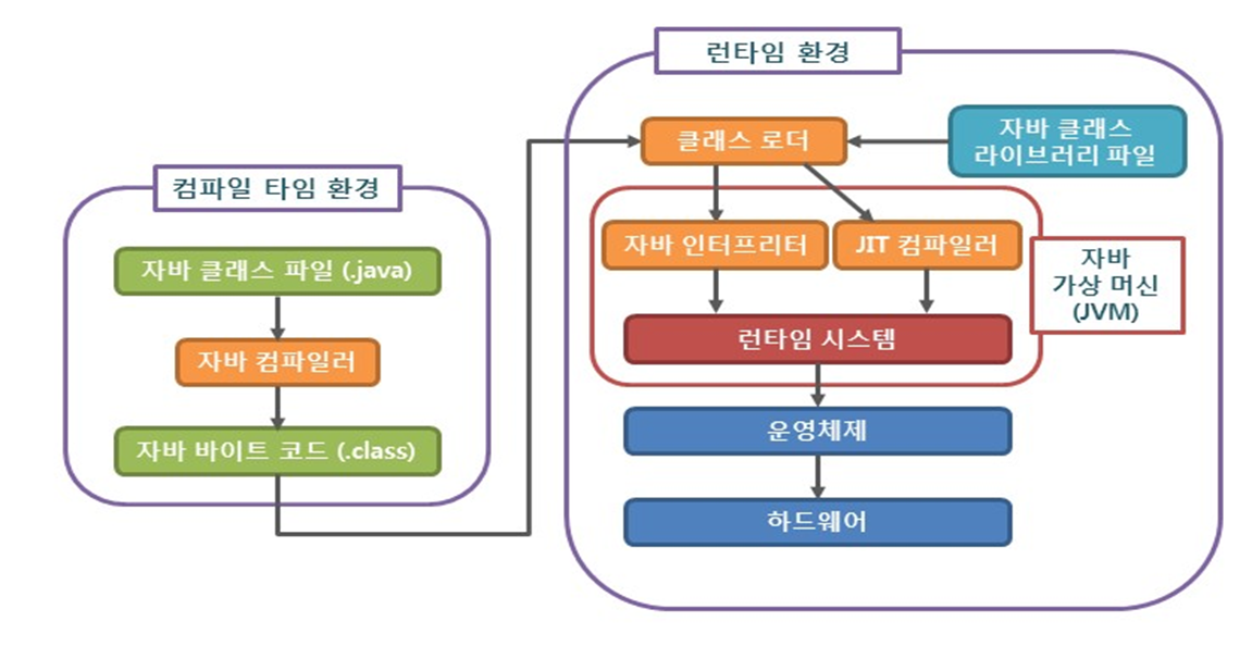 - 실행 환경: 자바 가상 기계 + 자바 플렛폼의 다양한 클래스 라이브러리(자바 API)