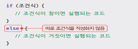 : If문의 조건식의 결과가 참이면 {코드 블록}, 거짓이면 else문 {코드블록} 수행