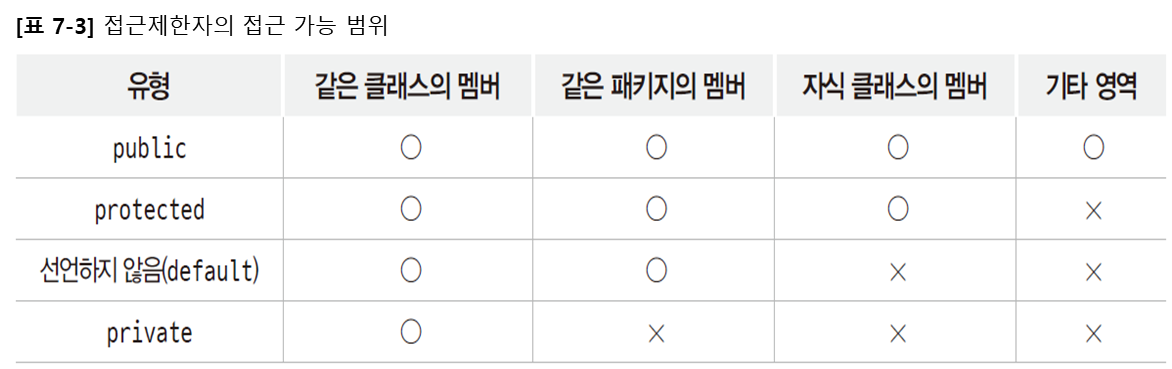 - 접근제한자는 생성자의 접근을 제어하는 데 사용할 수 있음. 즉 다른 클래스가 생성자를 호출할 수 있음.