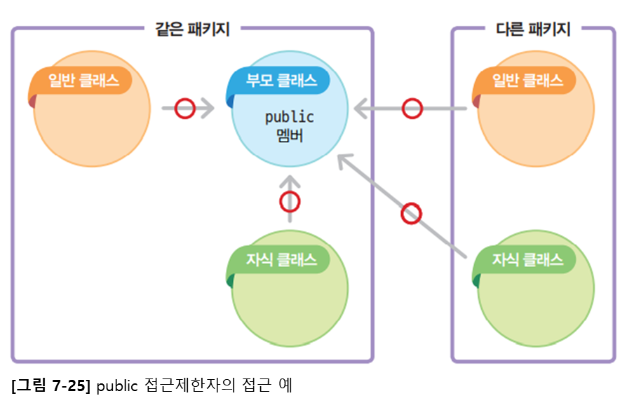 - public 접근제한자가 선언된 클래스 멤버(변수, 메서드, 생성자)