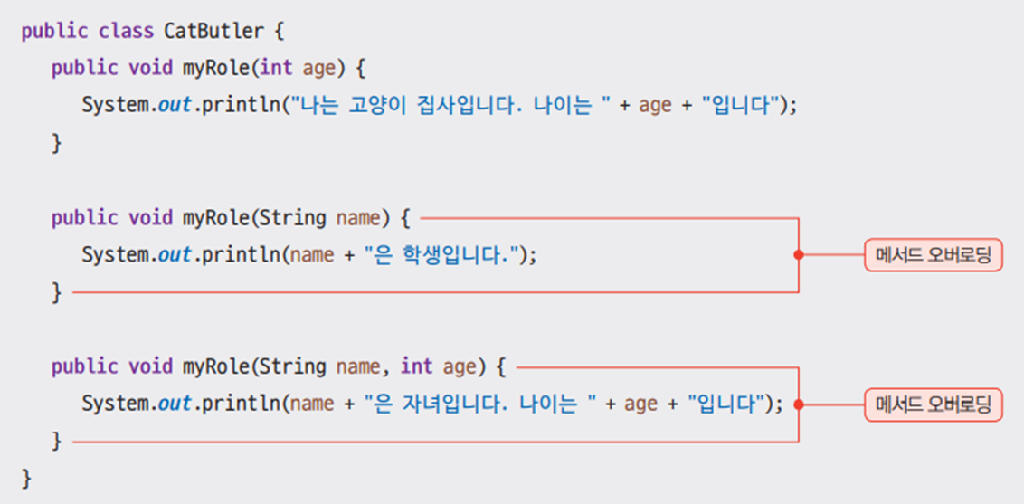 - 메서드명이 같지만 메서드에 전달된 매개변수의 자료형 또는 개수가 다른 둘 이상의 메서드를 가짐