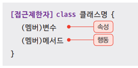 - 멤버변수, 멤버 메스드, 생성자(생략 가능)