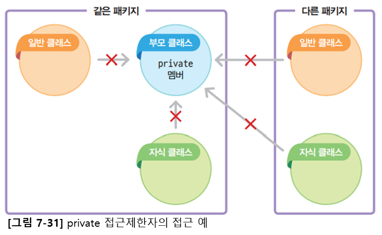 - private로 선언된 필드, 메서드, 생성자는 엄격하게 제어되므로 둘러싸는 클래스 외부에서 접근할 수 없음.